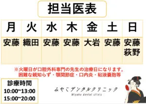 news 2023.04.12 4月16日より担当医表に変更がありますこんにちは🎶名古屋市西区のイオンモールNagoya Noritake Garden内の歯医者さん😁みやこデンタルクリニックです🦷4月16日より先生の勤務週が変更になります🙇🏻♀️🙇🏻♀️毎週水曜日でした口腔外科の日が毎週火曜日に変更になります🫡また、一般歯科治療の先生方にも変更がありますので皆様ご理解とご協力をよろしくお願い致します🙇🏻♀️これからも日々スタッフ一同、最善・最良の治療、おもてなしができるように日々切磋琢磨してまいります💪 みやこデンタルクリニックfacebookLinetwittergoogle